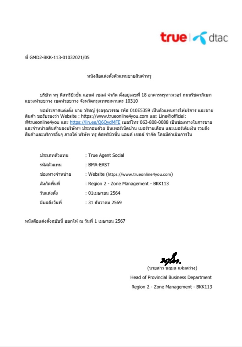 หนังสือแต่งตั้งตัวแทนตัวแทนขายสินค้าทรู