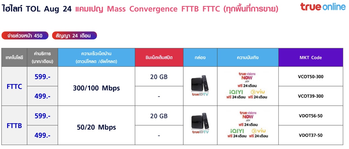 - สิทธิ์คืนค่าแรกเข้า 100 บาท (5 รอบบิล) เมื่อชำระค่าแรกเข้าจำนวน 450 บาท ณ วันที่ติดตั้ง ตามเงื่อนไขแคมเปญแพ็กเกจ