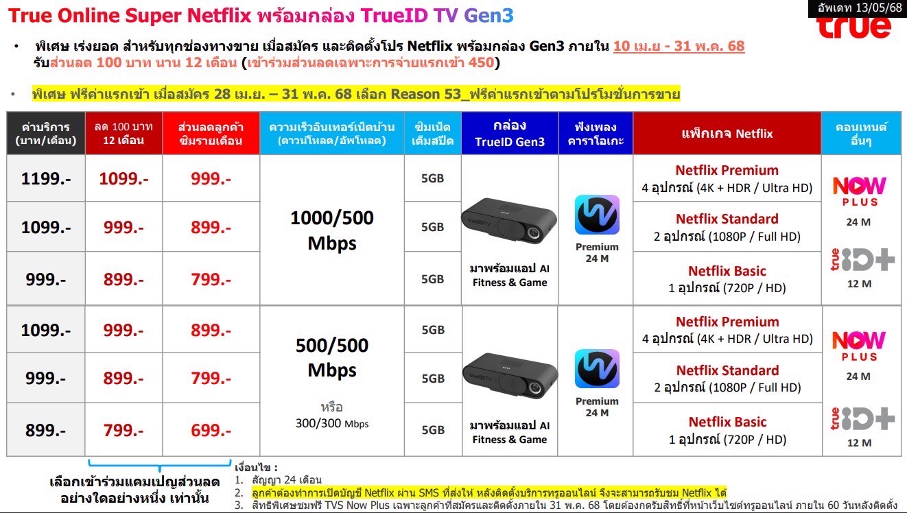 - พิเศษ รับสิทธิ์ชมคอนเทนต์ True Visions Now หลังติดตั้งลูกค้ากดรับสิทธิ์จาก link ที่จัดส่งให้ทาง sms ที่ลงทะเบียน ด้วยเงื่อนไขการสมัครแพ็คเกจ ดังนี้